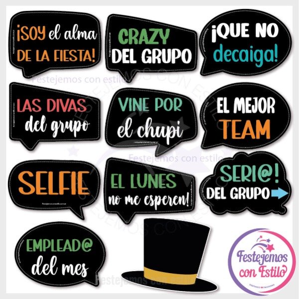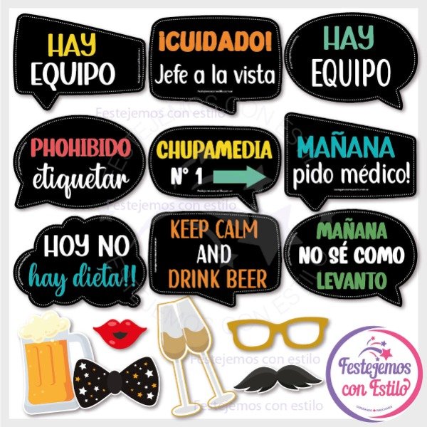 El kit incluye todos los carteles con frases y props dibujos que se muestran en las fotos.