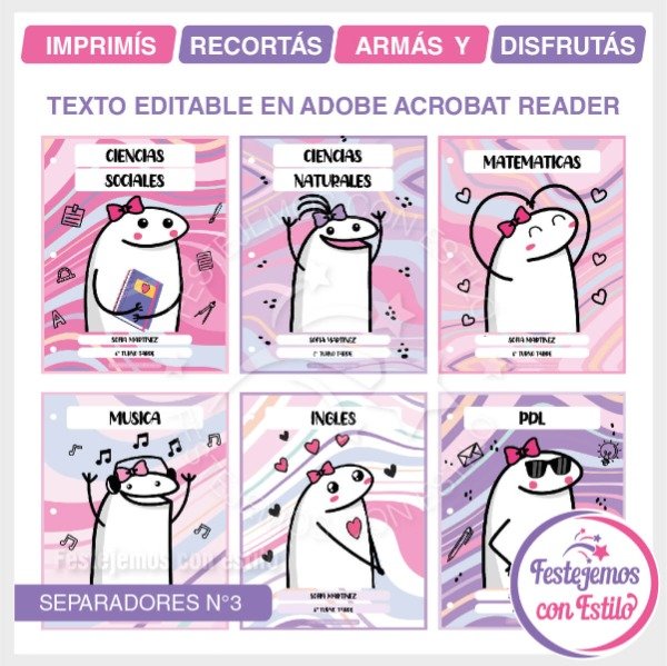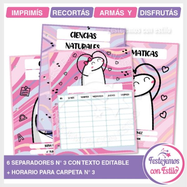 Kit escolar de separadores de carpeta N° 3 para imprimir, con la tematica de Flork rosa y lila