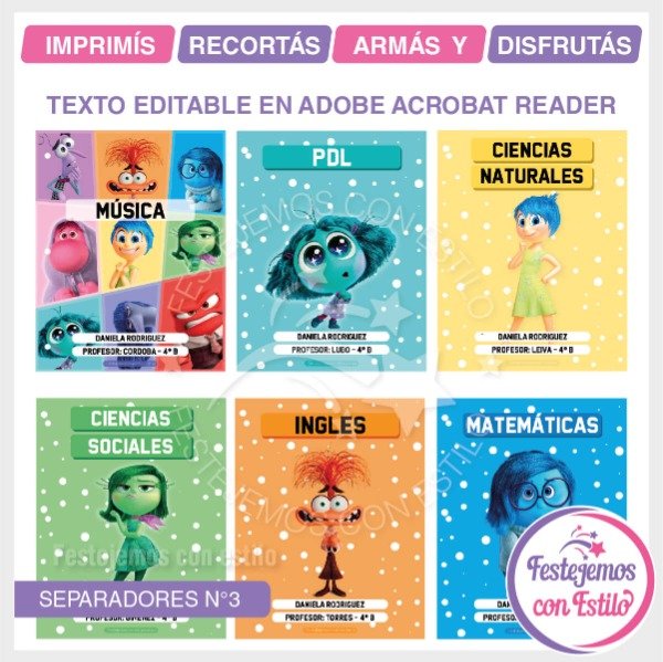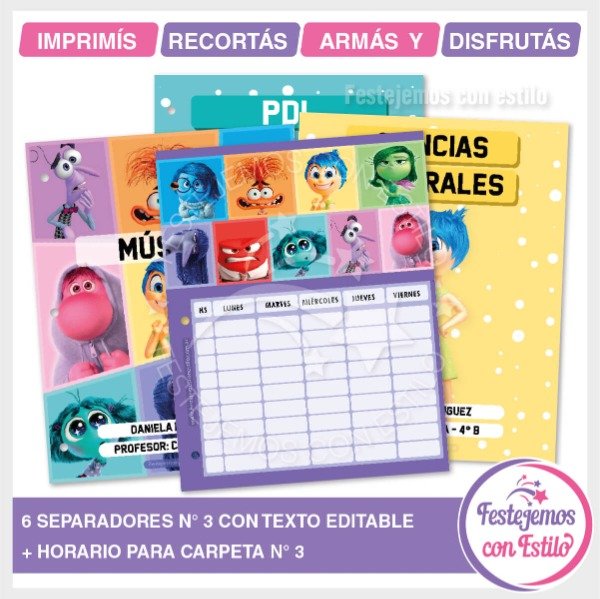 Kit escolar de separadores de carpeta N° 3 para imprimir, con la tematica de Intensamente