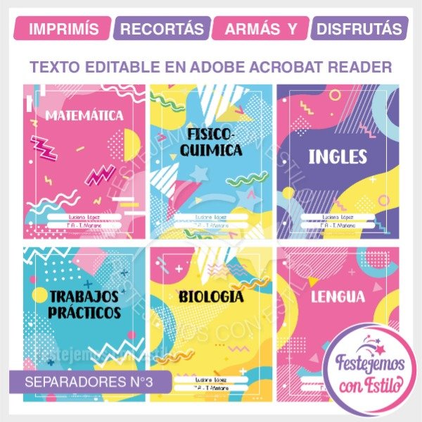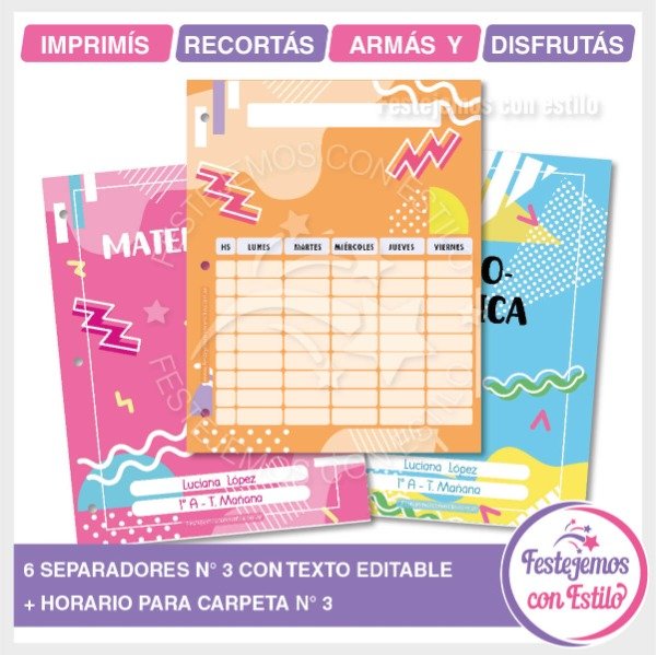Kit escolar de separadores de carpeta N° 3 para imprimir, tematicaMemphis color en diferentes colores