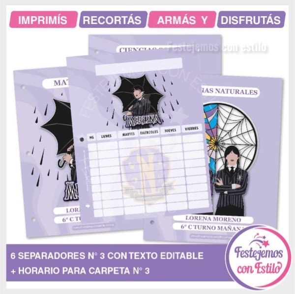Kit escolar de separadores de carpeta N° 3 para imprimir, con la tematica de Merlina Addams