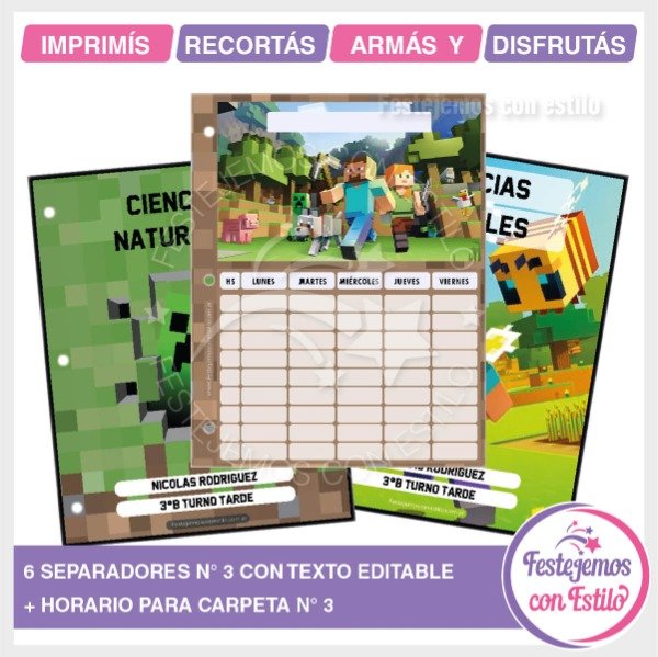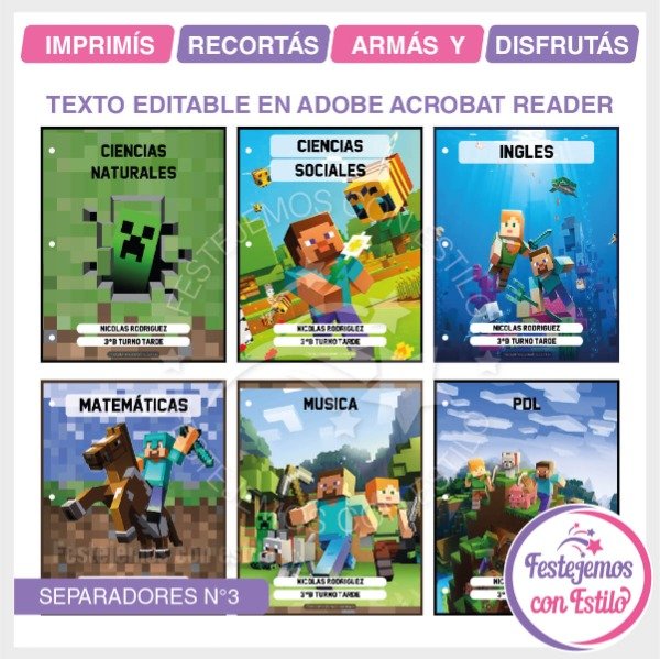 Kit escolar de separadores de carpeta N° 3 para imprimir, con la tematica de Minecraft
