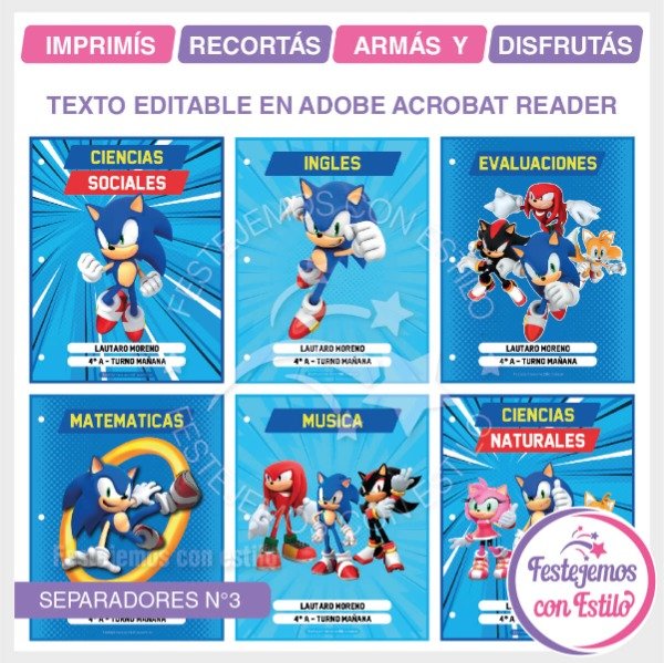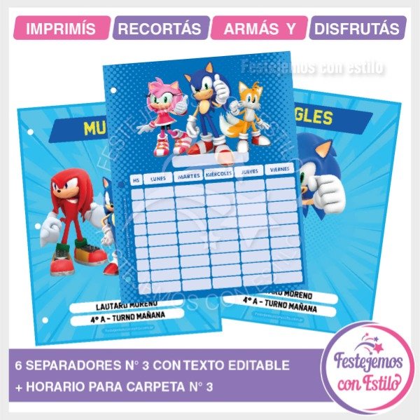 Kit escolar de separadores de carpeta N° 3 para imprimir, con la tematica de Sonic